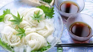 I noodle somen sono molto fini. Bianchi e di forma allungata, sono realizzati con farina di grano, sale da cucina e acqua. Rispetto ai noodle udon sono più sottili. Freddi e immersi in un brodo di pesce (dashi) con salsa di soia e decorati con zenzero fresco, questi noodle sottilissimi sono un piatto molto popolare soprattutto nelle calde estati.